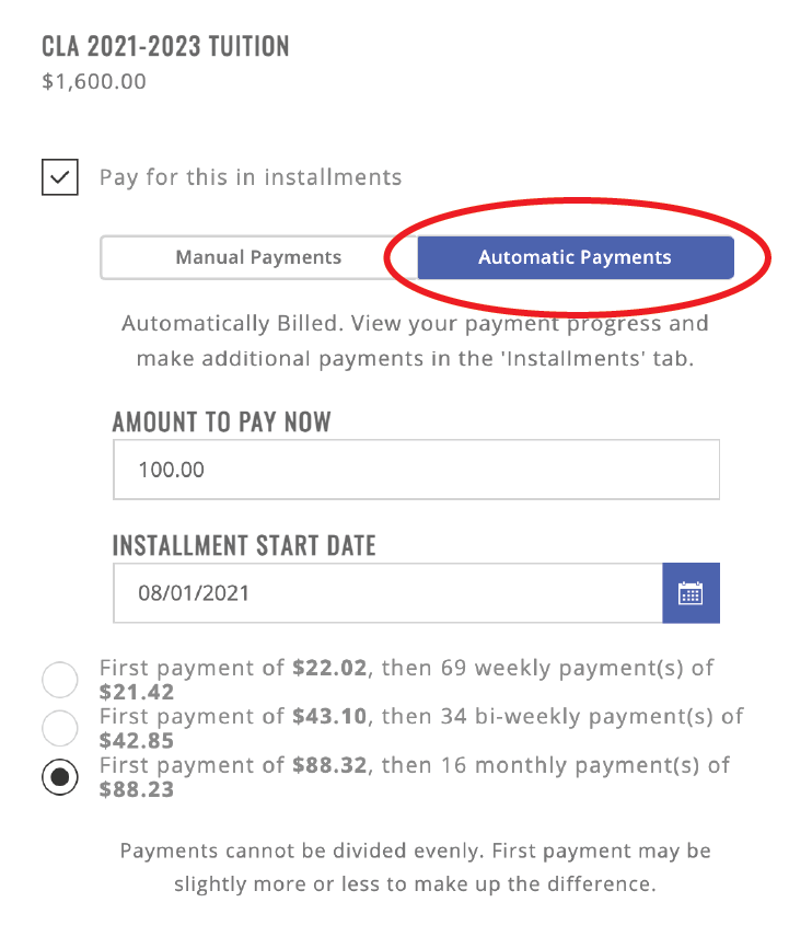 7. In the “CLA Tuition” section, check the box that says “Pay for this in installments.”